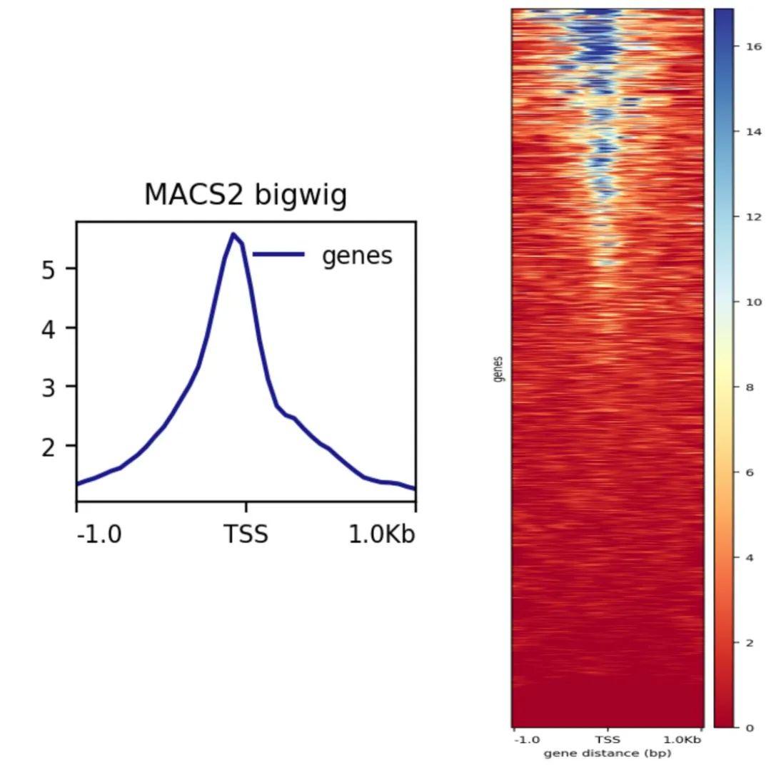 首先我们在文章中经常可以看到以转录起始位点 (TSS) 为中心的峰图和热图(如下图),Each line will be a transcript,通过染色质开放与否识别启动子区域、潜在的增强子或沉默子,因为启动子区域没有明确定义,在基因内部或距离TSS 2.5kb是比较常用的范围。