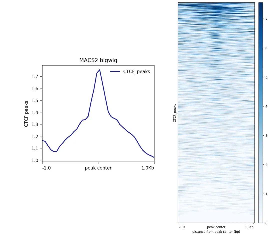 以下图CTCF为例,ChIP-seq的峰就是CTCF的结合区域,中部位置为CTCF的motif,而 ATAC-seq的reads富集在motif两端,横向代表基因组坐标, 纵向代表ATAC-seq的信号强度。
