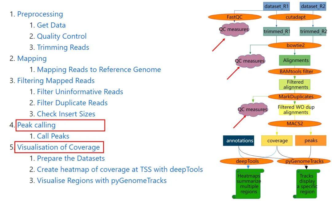 这张图总结了整个数据分析过程,我们重点关注的文章结果图也是主要在Peak calling和Visualisation这两步,如果有小伙伴获得Raw data想自己分析的话,老熊在这里推荐两个教程,个人觉得非常全非常干货: