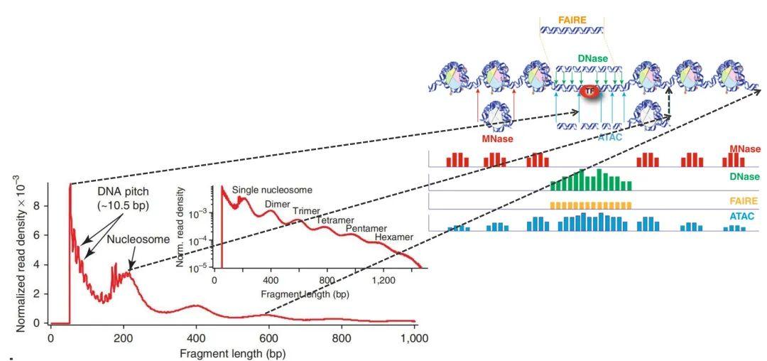 我们可以发现在150bp前出现第一个峰,这个峰值代表的就是切掉了开放的染色质区域,同时伴随着规律的锯齿状小峰,基本是10bp一个小锯齿。在200bp左右处的峰值主要是由于切割核小体导致的,前面我们提到了,一个核小体缠绕的DNA大约在147bp,加上切割的时候不可能那么精确,所以大概在200bp。后续的峰值代表切下来两个、三个核小体以及n倍核小体情况,而且峰值是越来越低的,说明切割到染色质远端的核小体的概率是越来越低的。