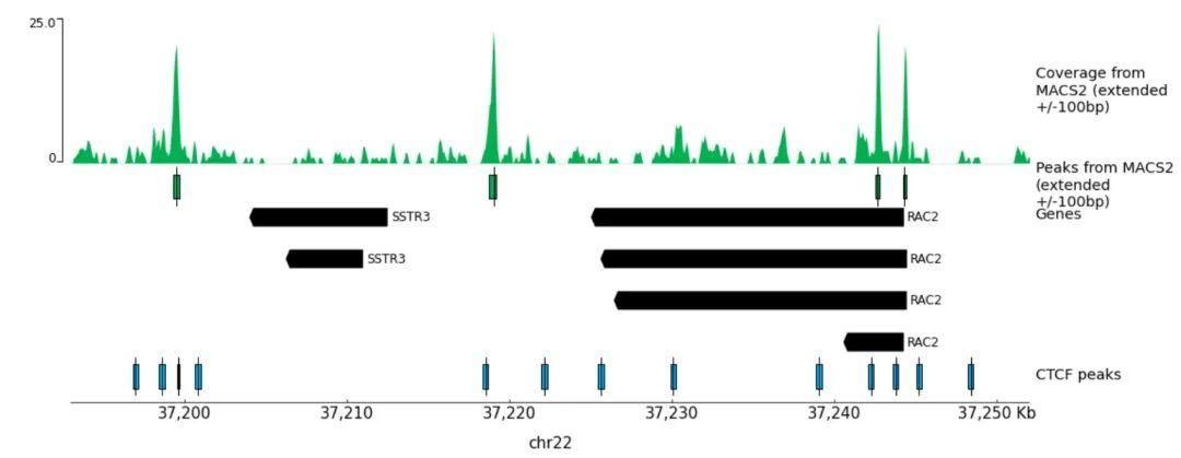 可以看出,在RAC2基因染色质开放区域,对应着CTCF转录因子结合。