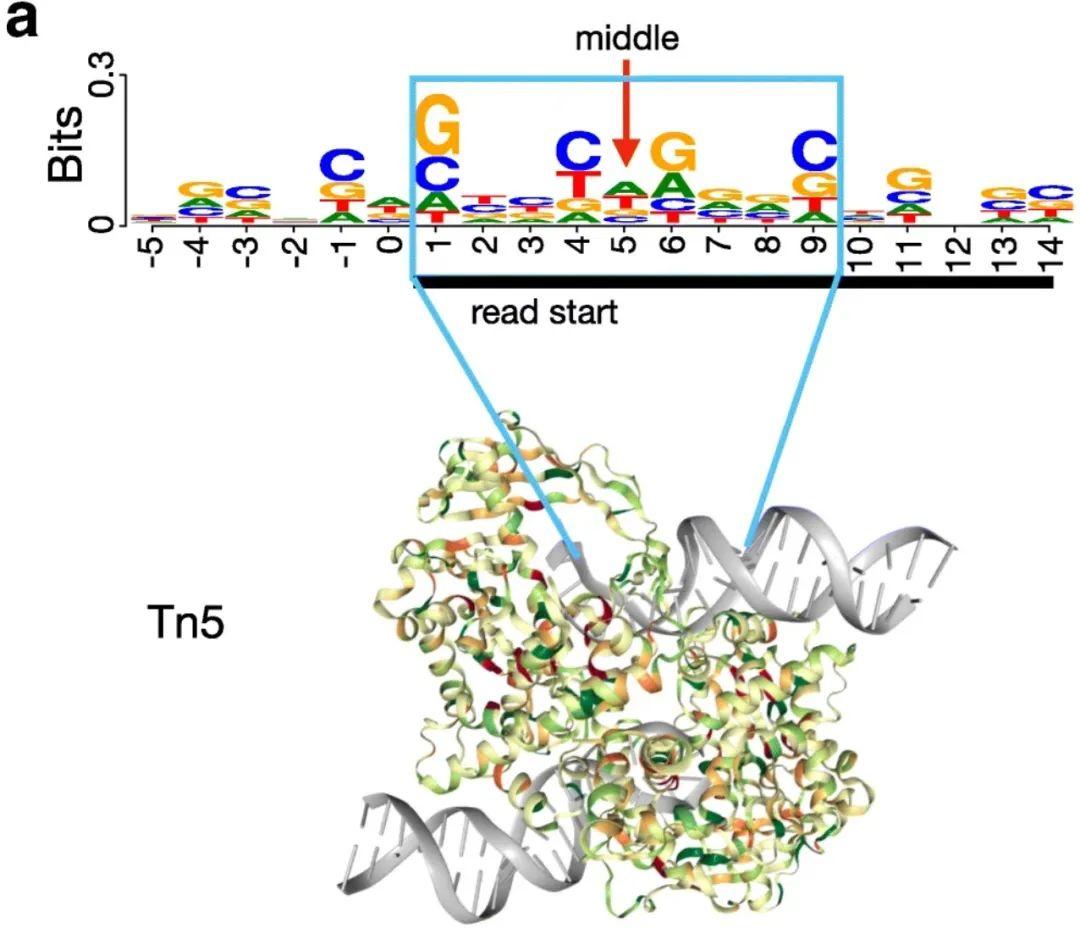 这个技术用到了一个转座酶Tn5:DNA转座是一种由DNA转座酶介导,把DNA序列从染色体的一个区域插入到另外一个区域的现象,类似于“剪切粘贴”。这个过程,也是需要插入位点的染色质是开放的,否则就会被一大坨高级结构给卡住。